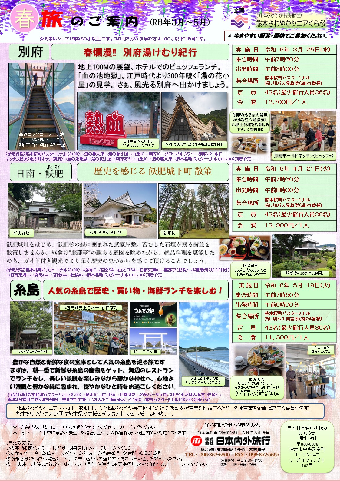 桜の開花が進む3月には湯けむりの別府へ、4月には日南飫肥まで足を延ばし、潮騒の糸島観光を5月に用意しました。
