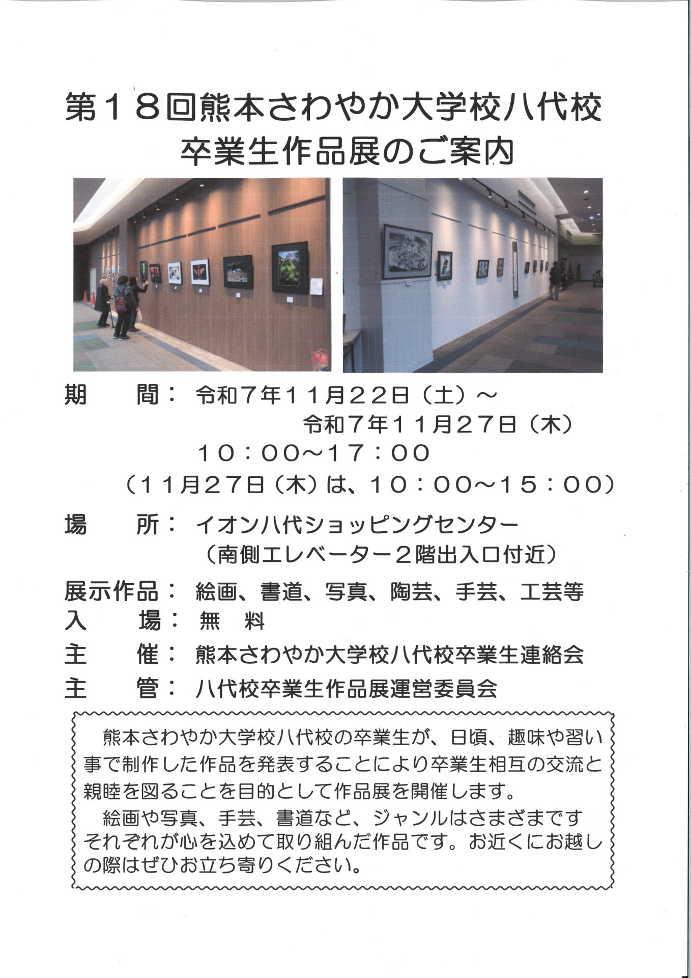 熊本さわやか大学校八代校の卒業生が、趣味や習い事で制作した作品を発表することにより、卒業生相互の交流と親睦を図ることを目的として例年開催されています。